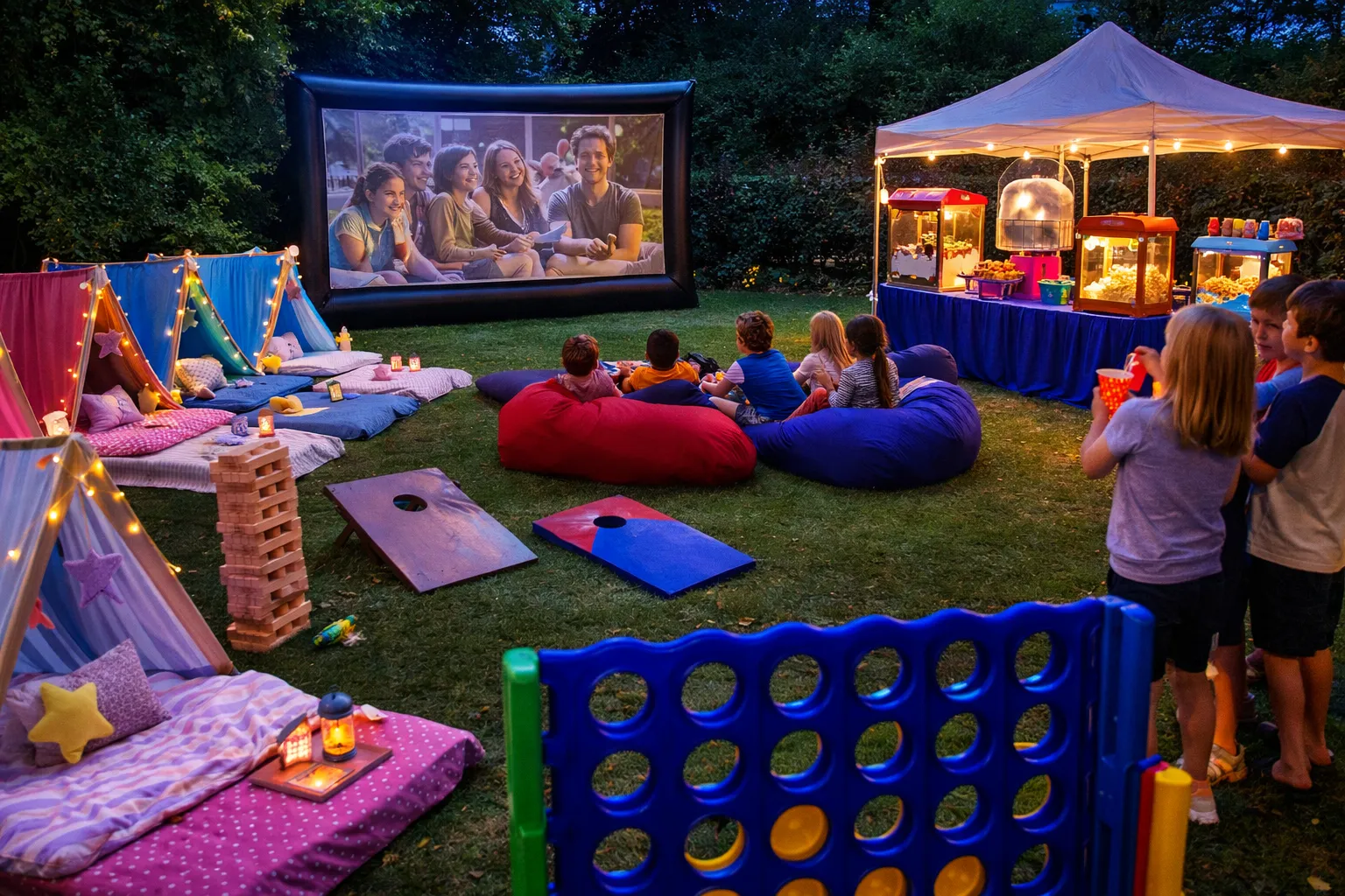 Build the ultimate party experience with our customizable bundled capsules. Pair outdoor lawn games, concessions machines, and sleepover tents for an epic sleepover setup your guests will love. Add our inflatable outdoor movie screen for backyard movies or video game nights. It is an easy way to turn your home into a full event experience.